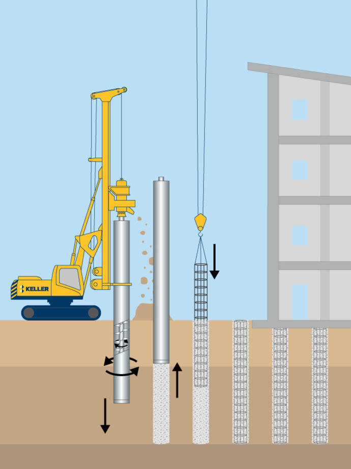 Cased CFA piles are constructed by rotating a hollow stem continuous flight auger within a temporary casing into the soil to a designated depth. The double rotary drive units for the auger and casing rotate in opposite directions, simultaneously drilling them into the ground. This allows for faster continuous drilling while the casing helps to keep the pile vertical, which is of particular importance for applications such as secant pile retaining walls. Concrete or grout is pumped through the hollow stem, maintaining static head pressure, to fill the pile drill hole as the auger and casing is slowly removed.